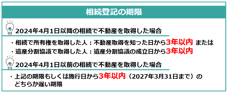 | ❷義務化前の相続で不動産を取得している場合 以下のどちらか遅い方が期限となる ・相続で所有権を取得した人:不動産取得を知った日から「3年以内」または ・遺産分割協議で取得した人:遺産分割協議の成立日から「3年以内」 ・施行日から3年以内(2027年3月31日まで) |
